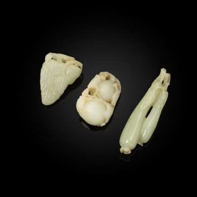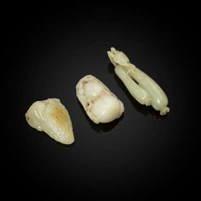 comprising: a pale celadon pendant in the form of two long melons on stems with leaves; a white jade 'double-gourd' pendant with leaves; and a pale celadon with russet skin jade pendant carved in the form of a fruity grape with leaves