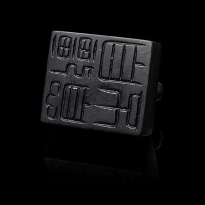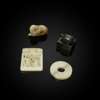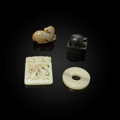comprising: a greyish white with russet skin jade carving of a recumbent dog; a black jade seal with a tortoise knob and the carved with 'Zi Qiang Bu Xi (Strengthen self without stopping)'; a small white jade disc bi carved with archaistic taotie and chi-dragon' in low relief, the middle of the stone of greyish tone; and a white jade 'boys at play' with marriage motif reticulated plaque