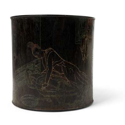 of cylindrical form with lipped mouth rim and base, the exterior finely incised with a beautiful lady taking a bath in a candle-lit chamber, with a long table and flower pots decorating the interior, a male figure sneakily peeping from the open window, the incised lines highlighted with various colours