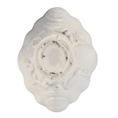 of rhinoceros horn form, moulded on one side with recumbent tiger underneath towering prunus and dragon on top, reverse with deer and crane, covered overall with a thick creamy white glaze with ivory tinge