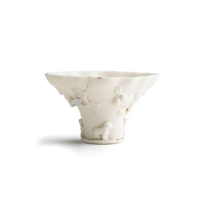 Note: A similar pair of libation cups, dated to the late Ming dynasty, was sold at Sotheby's London, 22 Feb 2022, lot 92; a further comparable Dehua libation cup, similar in size and decoration, dated to the Qing Dynasty, 18th century, is in the British Museum, museum no. 1980,0728.647.