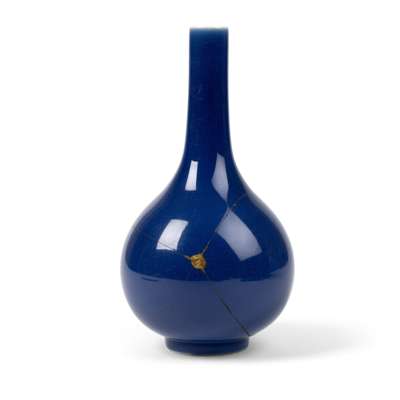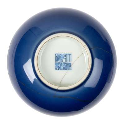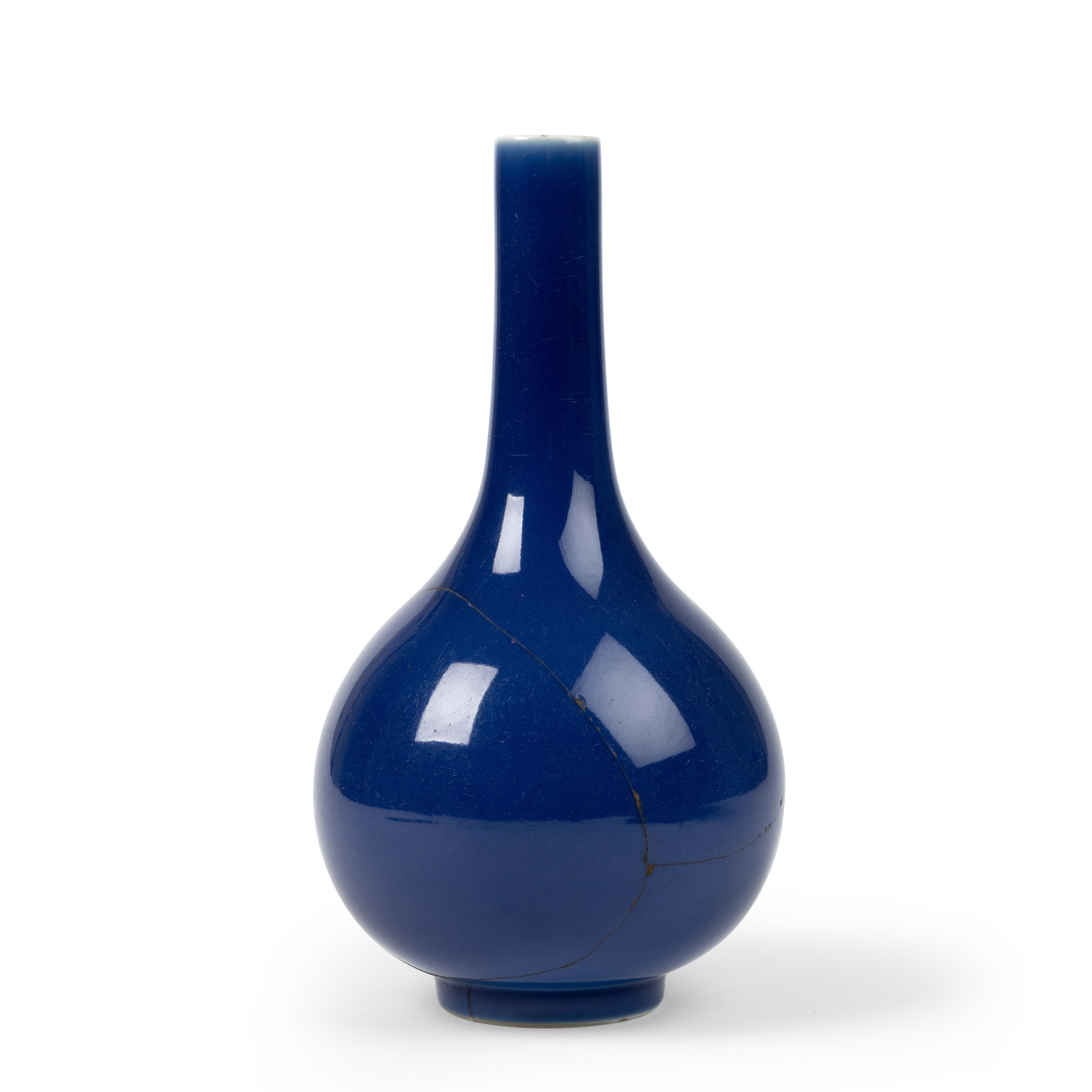 the bulbous body surmounted an elegant long neck, the exterior covered with a dark blue glaze, the base inscribed with a six-character Qianlong mark in underglaze blue on a white ground