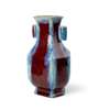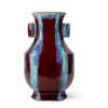 the six-sided vessel rising from a flared foot to a wide belly to a waisted neck, the neck flanked by a pair of tubular lug handles, covered overall in a claret coloured glaze with a milky lavender glaze streaking the neck and along the six corners, the base inscribed with a six-character Qianlong mark beneath a brown glaze