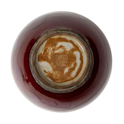 the bulbous body rising to wide shoulders and waisted neck, terminating to a flared rim, covered overall with an uneven red glaze suffused with lavender and blue streaks, the glaze thinning on the mouth revealing a yellowish-brown coloured body, the thick glaze pooling and forming the foot, the base incised with a six-character Qianlong mark and covered with an ivory crackled glaze over brown paint, the foot ring unglazed revealing the fine porcelain body