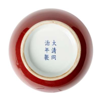 the bulbous sides raised from a slightly everted foot to a waisted neck and flared rim, covered to the exterior with a pale red glaze stopped neatly on the foot, the base inscribed with a six-character Tongzhi mark in underglaze blue