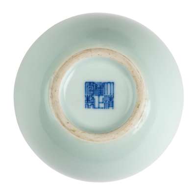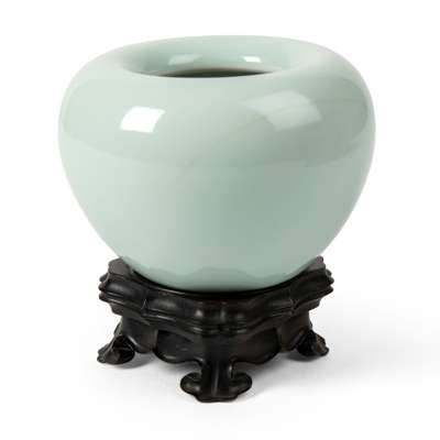 the globular body raised from the sunken base, tapering toward the wide shoulders and curving inward to the rounded interior of the neck, covered overall with a pale blueish-green glaze leaving only the foot ring unglazed, the base inscribed with a six-character Yongzheng mark in underglazed blue, with a fitted wooden stand