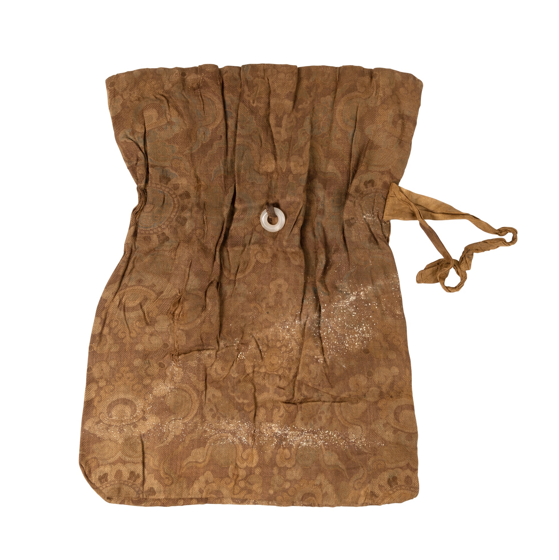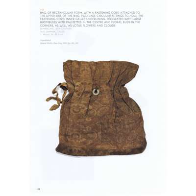 of rectangular form, composed of sections of fine woven silk, with a fastening cord attached to the upper side of the bag, two white circular jade fittings to hold the fastening cord, decorated with large rhombus with palmette to centre and floral buds in corners, lotus flowers and clouds, lining of brown gauze