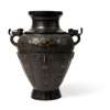 the body supported on a tall splayed foot, the shoulders encircled by a band of archaistic taotie motif against a key-fret pattern, the lower body further decorated with a band of kui-dragon pattern interrupted by notched flanges, and further with plantain leaves with phoenix motif, some decoration highlighted with parcel-gilt, the shoulder flanked with elephant-head handles