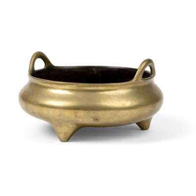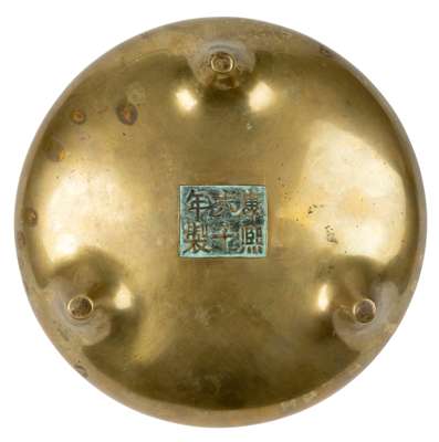 of compressed bulbous form supported on three short tapering feet, flanked by a pair of upward facing loop handles on the rim, the base cast with a six-character 'Kang Xi Liu Shi Nian Zhi (Made in the Sixty Year of Kangxi Reign)' in a recessed panel