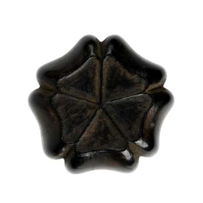 elegantly carved with five foliate lobes all the way from the body to the elongated neck, terminating into a splayed mouth rim, the wood has characteristic purplish hue