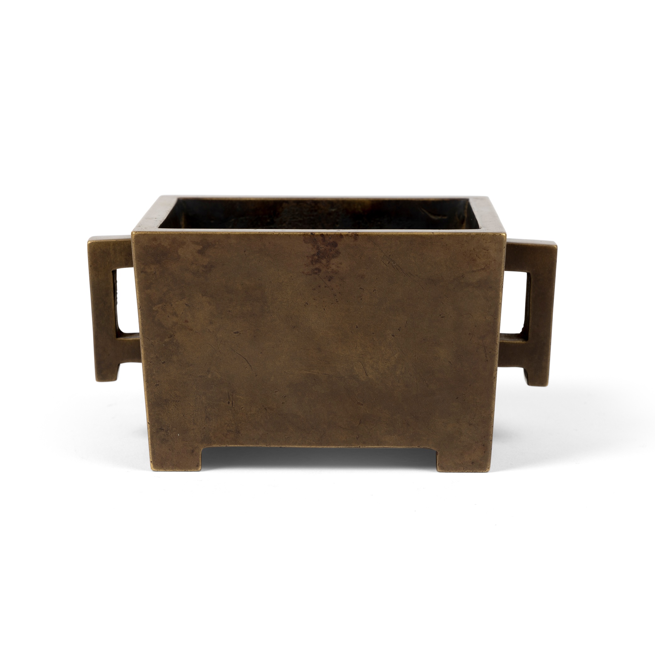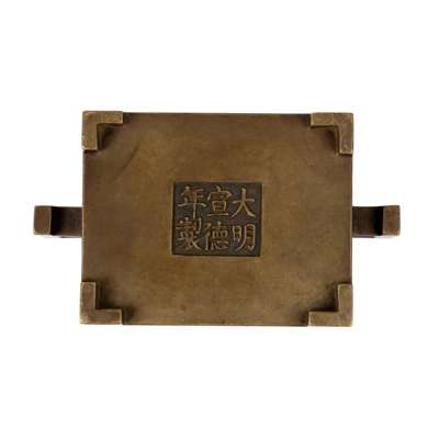 supported on four short bracket feet at the corners, flanked by a pair of stylised square handles on either side, the base cast with a six-character Xuande mark in a recessed panel
