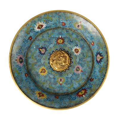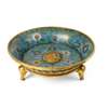 with everted rim, the flat base with a gilded bronze roundel in the centre decorated with a dragon and phoenix chasing a flaming pearl, the rest of the washer decorated on the interior and exterior with various lotus in tendrils, the mouth rim and the edge of the base with gilt mount, the vessel supported on three large feet in elephant-head form, the side of the mouth rim incised with a six-character Qianlong mark