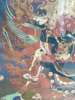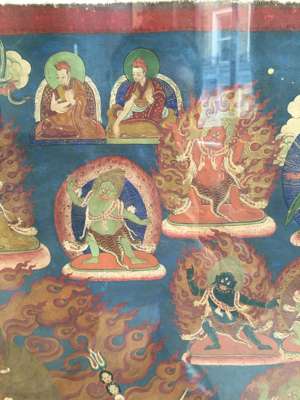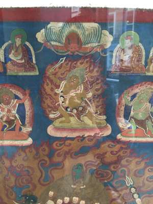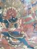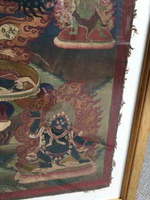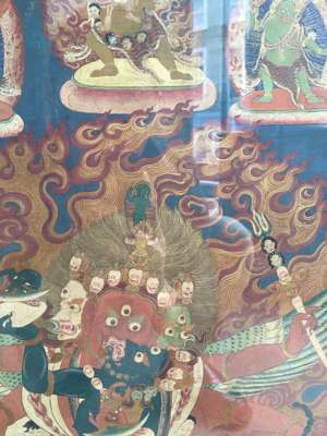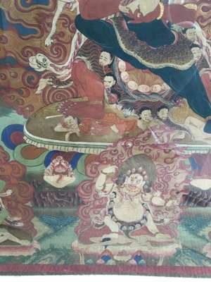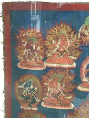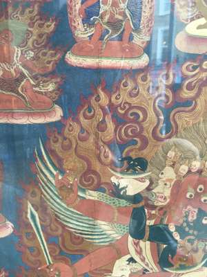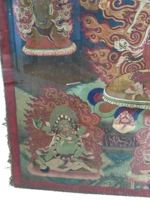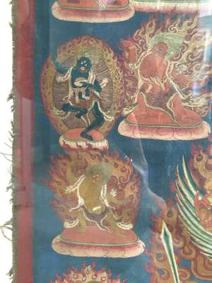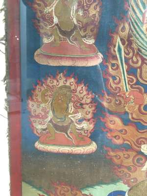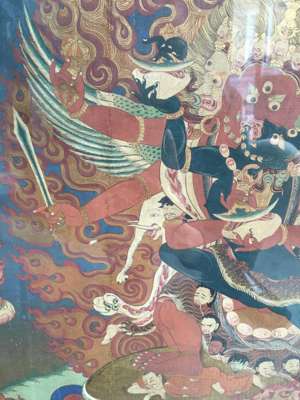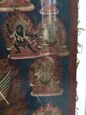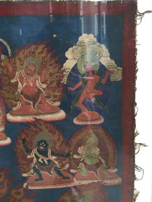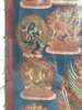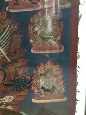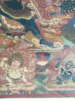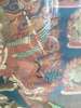 distemper on cloth, the wrathful incarnation of Padmasambhava depicted striding in alidhasana on two corpses and lotus throne, six hands holding attributes, including a vajra and vajra sword- khadga rising on left, a trisula khatvanga and scorpion on right, a kartika chopper and kapala before his consort wrapped around by two arms, the wrathful blue consort embracing the Lord with the left leg while holding aloft a set of kartika chopper and kapala, a pair of wings wide-spread before the flaming mandorla, flared elephant and tiger skins wrapped around his body, garlands of heads and skulls hanging between legs, enclosed by further wrathful protectors