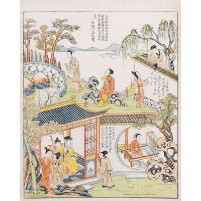 The last print in this lot depicts the first three months of the ballad Song of the Twelve Months in the Tune of the Tea Picker’s Song. It consists of three scenes from top to bottom, featuring ballads for January, February, and March according to the Chinese lunar calendar. Compare to a related example depicting ballads for October, November and December, see British Museum no. 1991,1015,0.1. According to the curator's comments, which potentially could apply to the print in this lot, 'this print incorporates scenes from three popular dramas, turning each of them into a ballad. By illustrating and combining popular folk songs with scenes of dramas of the time, Ding Liangxian created a new type of woodblock print for urban audiences.'