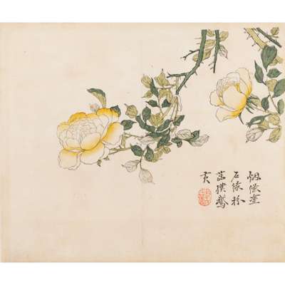 The two prints presented in this lot are leaves from The Mustard Seed Garden Painting Manual, first compiled by Wang Gai, and published in 1679AD. The manual aimed to showcase the ‘scholarly’ painting to the townsmen of Jiangsu, Nanjing. This work is recognised by many scholars as a preeminent painting handbook. Due to its success and popularity among the literati, The Mustard Seed Garden Painting Manual has been reprinted in China, Japan and Korea. Not only were classical painting compositions translated into the print medium, but contemporary artists also contributed painterly designs that served as both inspiring models and actual painting manuals.