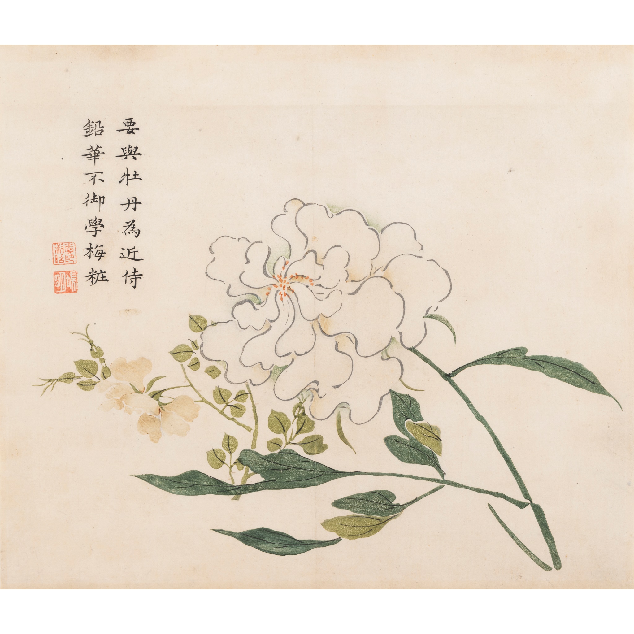 Both two prints in this lot depict peonies, the images are complemented with poems in fine calligraphy and with seals by the artist who designed them. The print with two seals is from the fourth volume of the manual. Compare the two seals in a related example, which also depicts peony sprays, dated to the Qing dynasty, Kangxi period, 1701AD, is in the British Museum, museum no. 1982,1011,0.1; The other related print with a comparable seal, dated similarly as the above, ca. 1700, is also in the British Museum, museum no. 1982,1011,0.19
