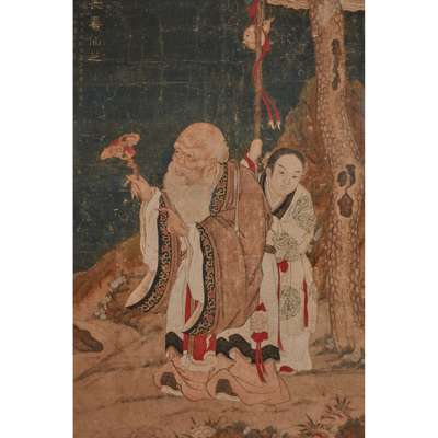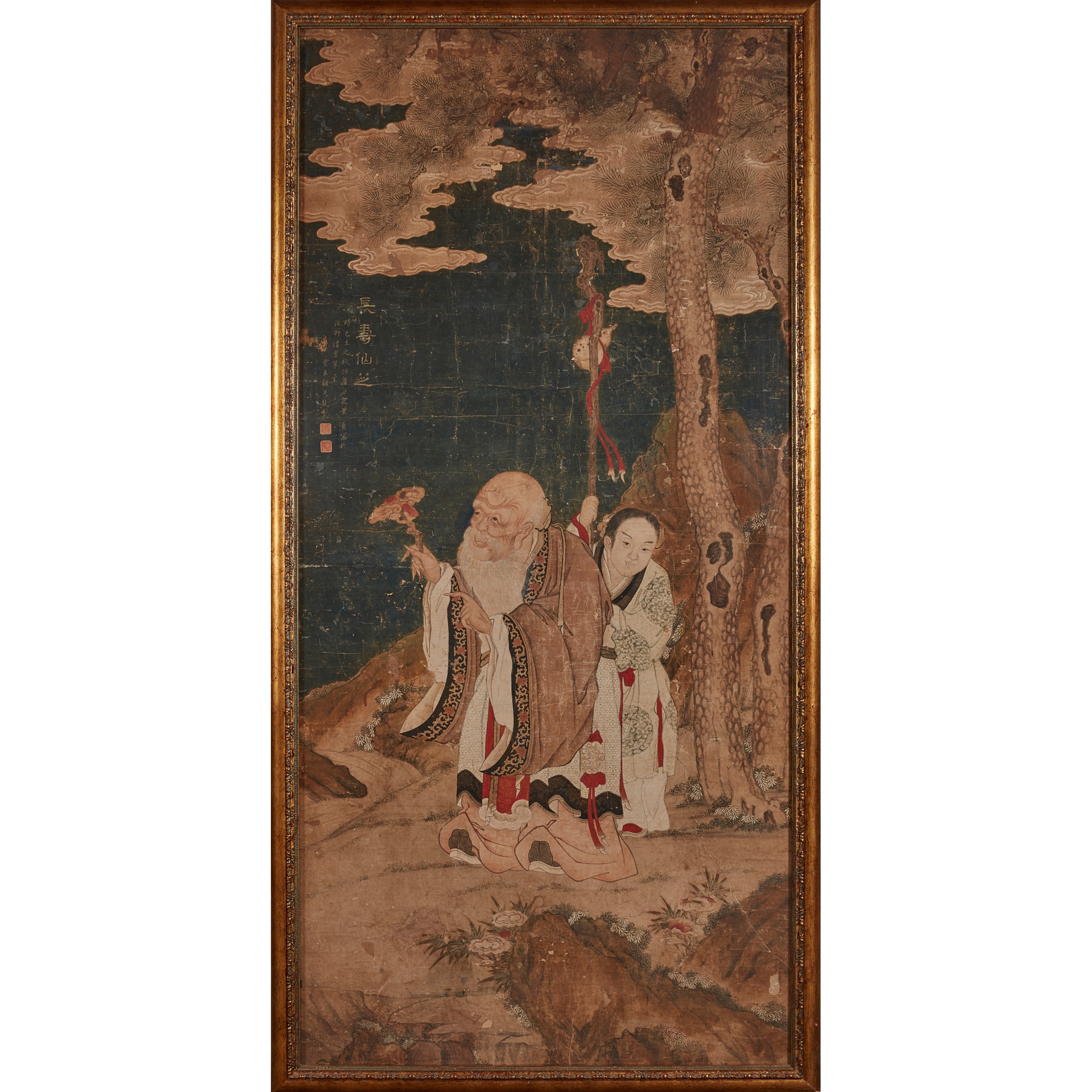 LARGE INK PAINTING OF THE GOD OF LONGEVITY, SHOULAO AND BOY, QING DYNASTY, 19TH CENTURY