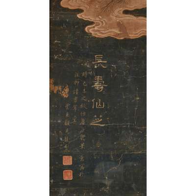 Note: There is little known about the painter Gu Jianlong, except that he served as a court artist in the 1660s-70s. He was born in Suzhou Taichang, and painted portraits of Qing emperors and imperial family members. His works are in the collection of The British Museum, see a portrait of Guanyin, museum numbers 1910,0212,0.486. Other extensive works are in The Nelson Gallery-Atkins Museum of Art, see a portrait of Ma Shiqi (1650–1714), illustrated in Wai-Kam Ho, et al., Eight Dynasties of Chinese Painting: The Collections of the Nelson Gallery-Atkins Museum, Kansas City, and The Cleveland Museum of Art. (The Cleveland Museum of Art in cooperation with Indiana University Press, c1980), 347-348, no. 255. For similar theme to this lot, compare with a smaller ink and colour on silk scroll painting, attributed to Gu Jianlong, depicting related subject matter 'Shoulao on White Deer', was sold at Christie's New York, 19 March 2021, lot 852; Another slightly smaller ink and colour on silk, with the signature of Gu Jianlong, was sold at Christie's New York, 19 Mar 2021, lot 852.