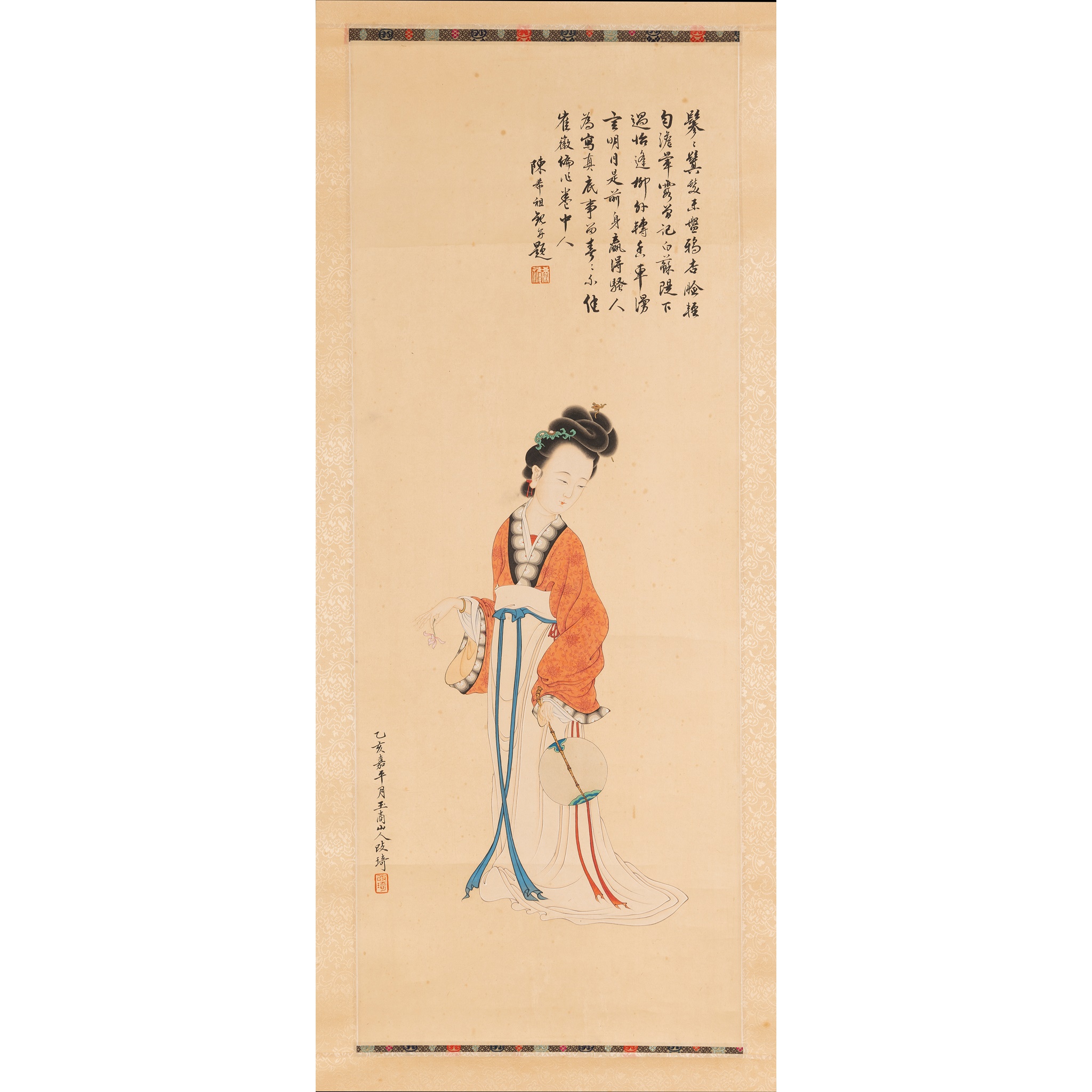 INK SCROLL PAINTING OF A LADY HOLDING A FAN