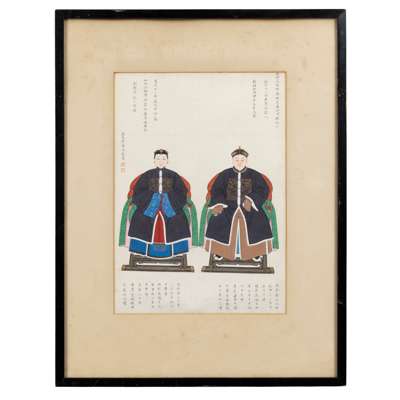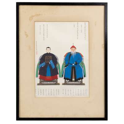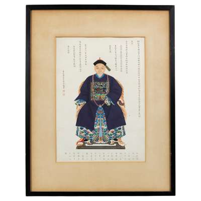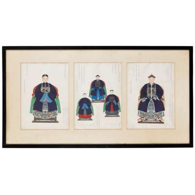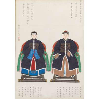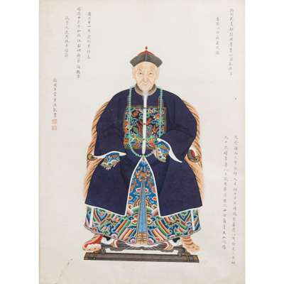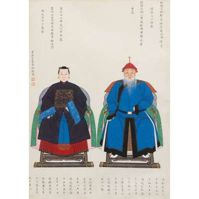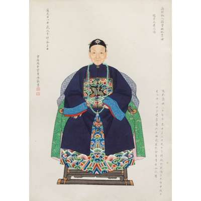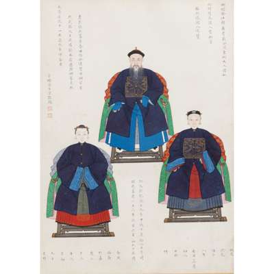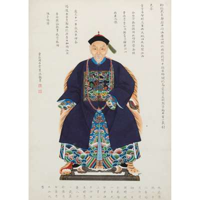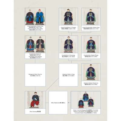 Note: The centre of this group of portraits is Zhou Zaotang, who commissioned this rare group of his ancestor portraits. This is to trace back, or celebrate the significance of his family in the political domain in the Qing Court. Spanning over three generations, Zhou's commission of his ancestor portraits are detailed with their respective names. However, in a patriarchal society, only the males have their full names and females their maiden names. The details also include their official ranks, political careers, dates and times of birth and death, and their burial sites.