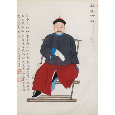 ink and colour on paper, framed, comprising the commissioner- Zhou Zaotang's portrait, shown seated on a horseshoe-back folding armchair, jiaoyi, his right leg folded, left hand holding a book, his face determined as he was newly appointed as an official on the new year of Xin Mao during the Daoguang period, corresponding to 1831AD, titled 'Chu Deng Shi Ban' (First Step of an Official Career), in the summer of Gui Si year (two years later), corresponding to 1833AD, further inscribed an enumeration of his aspirations on the left of his portrait; together with twelve of his ancestor portraits in eight works