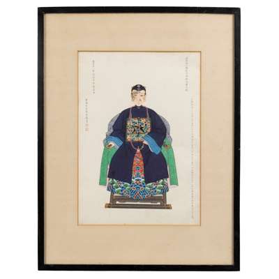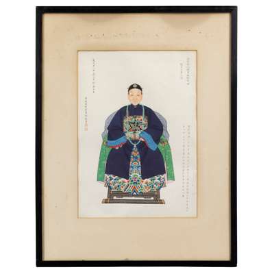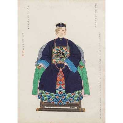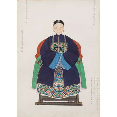 This collection offered here does not include Zhou Zaotang's wife. Therefore, it is unclear who she was. However, through the ancestor portraits of Zhou's father and mother in laws: Dai Binggang (1754-1818), his wife Madam Yang (1753-?), and his concubine Madam Zhang (?-1818), we can establish that she was Madam Dai.