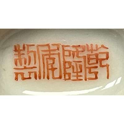 清末民初 乾隆款 礬紅彩秋雁圖鋪首 及 粉雪地套紫料博古圖鼻煙壺(共兩件)