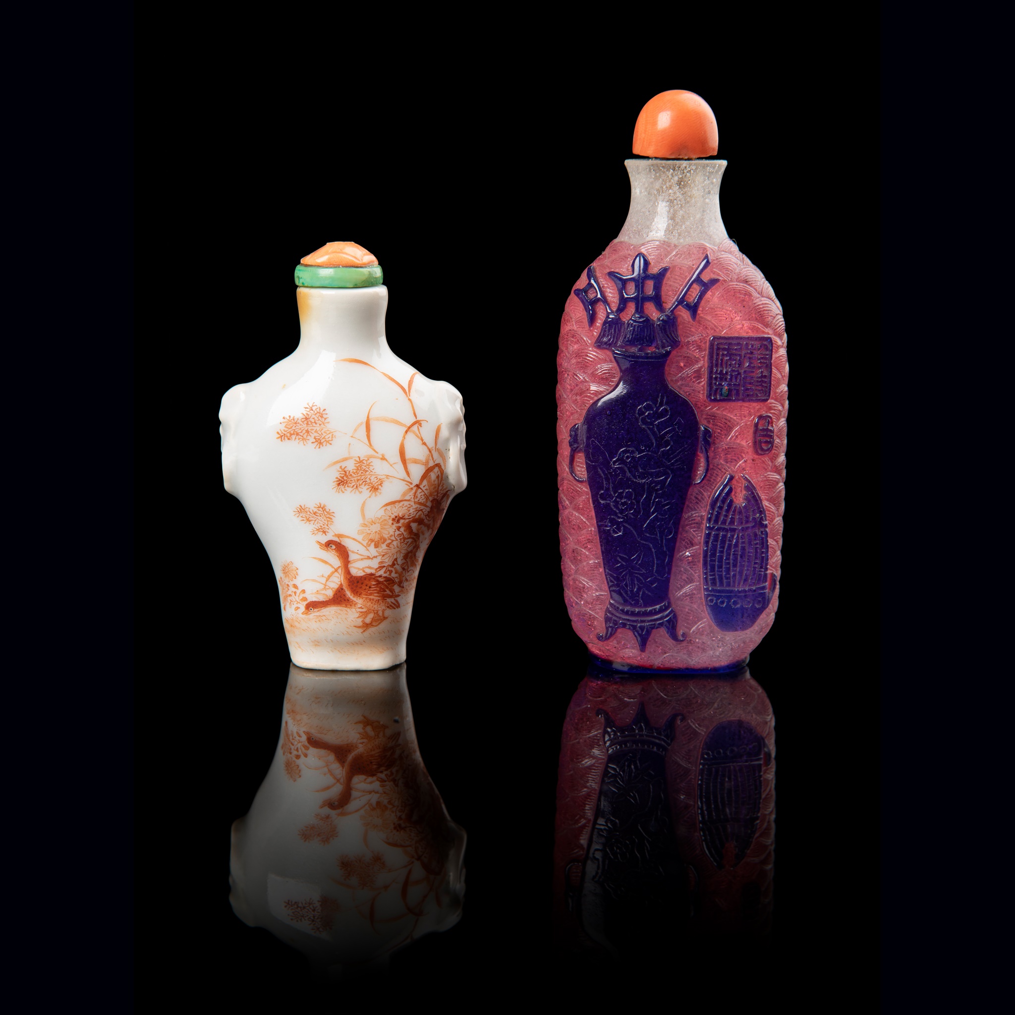 one vase-form handled porcelain snuff bottle, painted on one side with two wild geese under reeds in iron-red, the reverse inscribed with a corresponding poem, the base inscribed with a four-character Qianlong mark in iron-red, the coral stopper with a jade ring; the other oval-form glass snuff bottle decorated with bogutu hundred antiquities on either side in purple relief against a pink 'snow' ground in wave pattern, with a Qianlong mark in square on either side