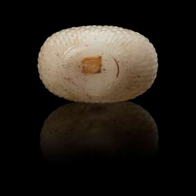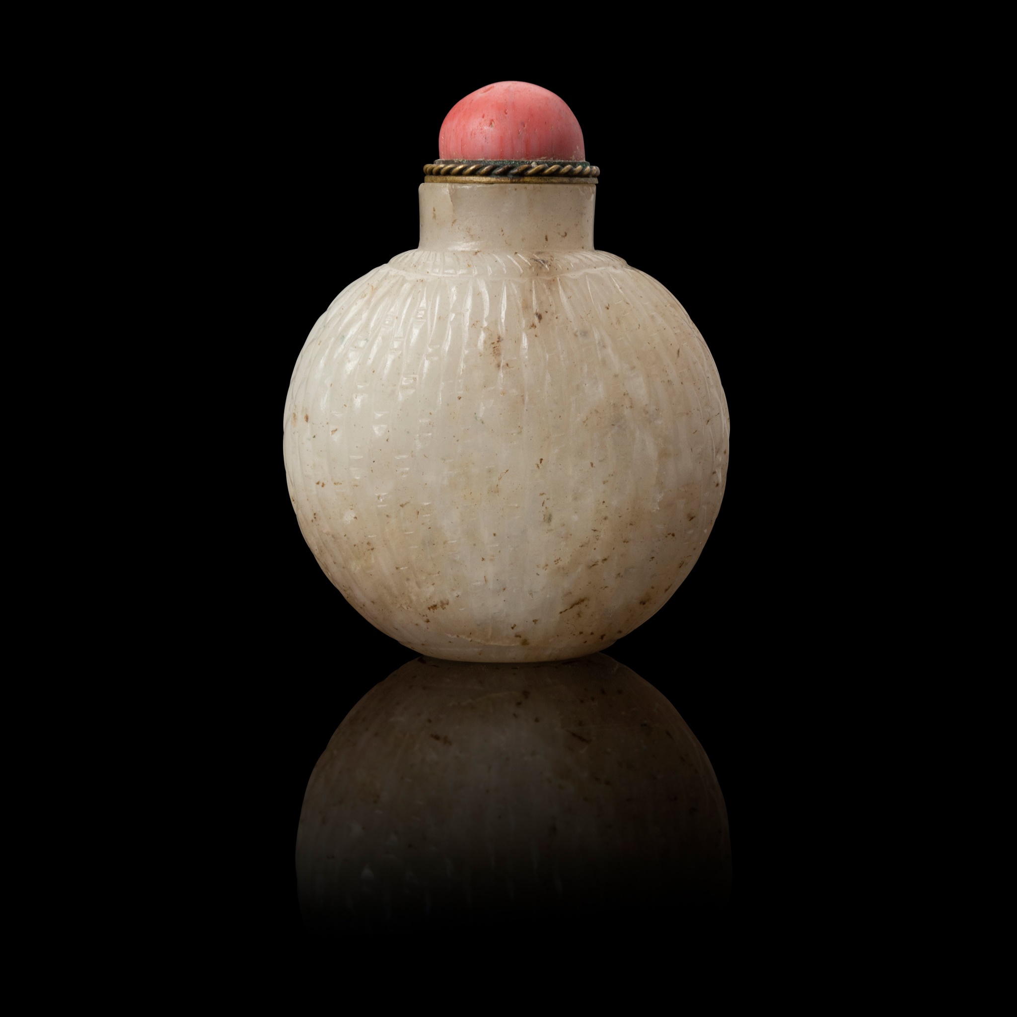carved in low relief with woven pattern around the body, the stone of white tone with minor russet inclusions, with a red stone stopper
