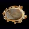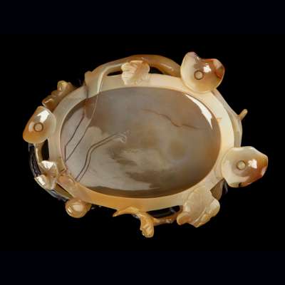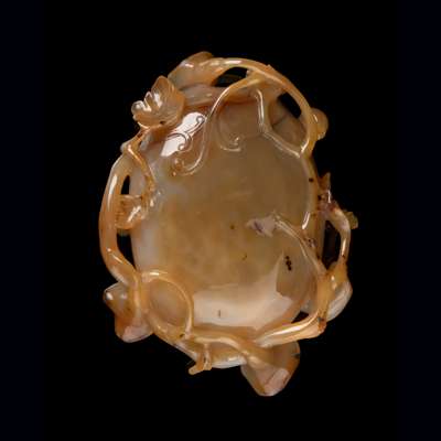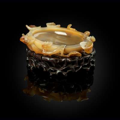 of oval form, carved in openwork with lotus and leaves around the pot, the stone with white and amber russet inclusions, with a fitted wooden stand