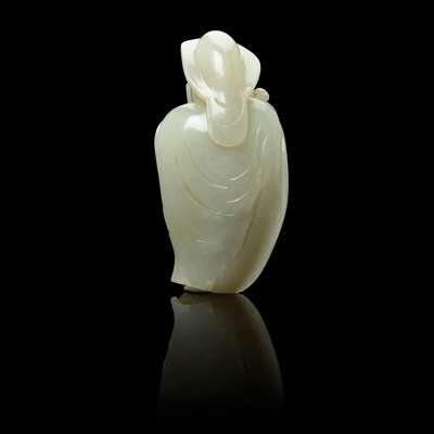 carved in the round with a barbarian man in a striding position, his left arm holding a treasure in front of the chest, the right hand holding a bird resting on his shoulder, the face vividly carved with bulging eyes and beard, wearing a stylised hat and long robes with cape, the stone of even pale celadon colour
