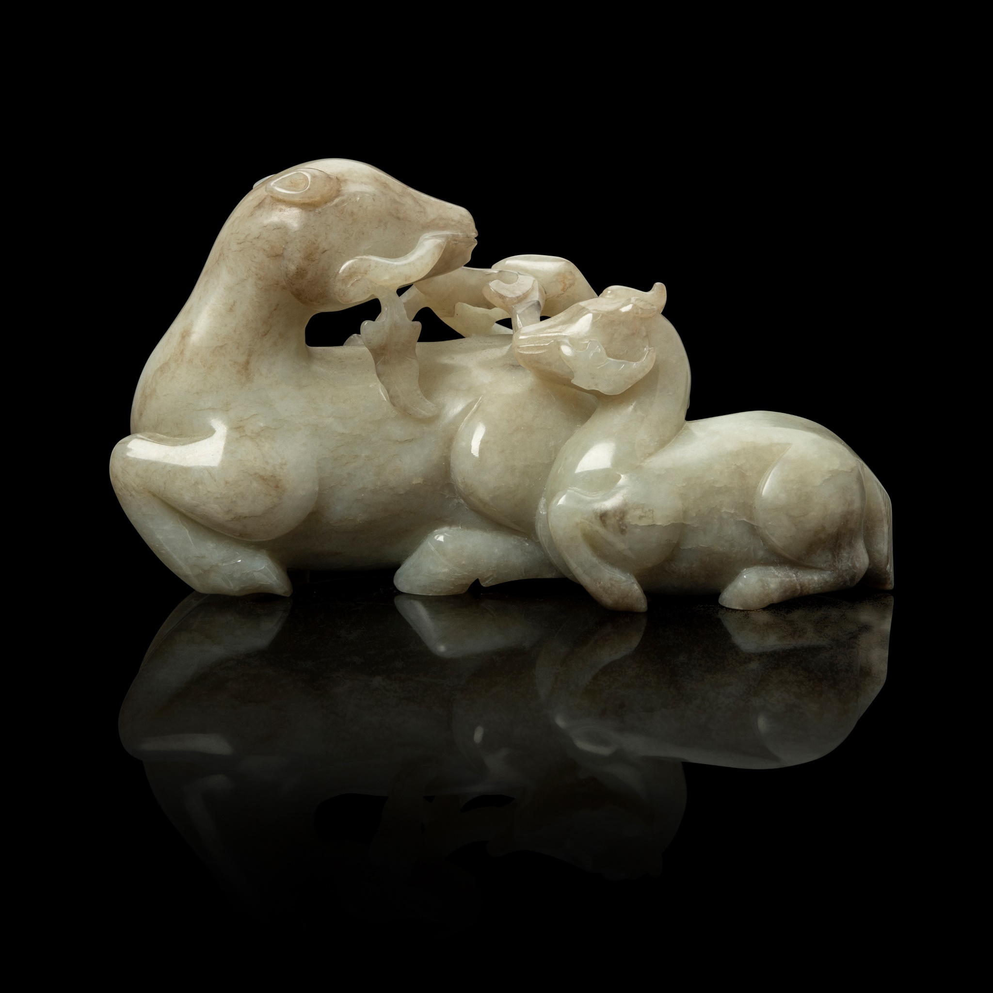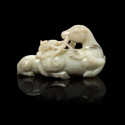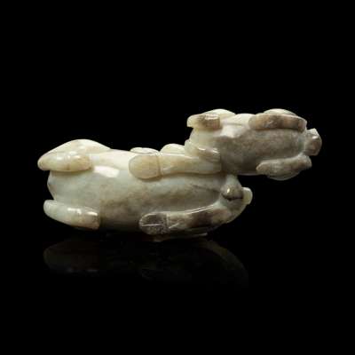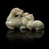 GREYISH WHITE JADE CARVING OF MOTHER HORSE AND FOAL