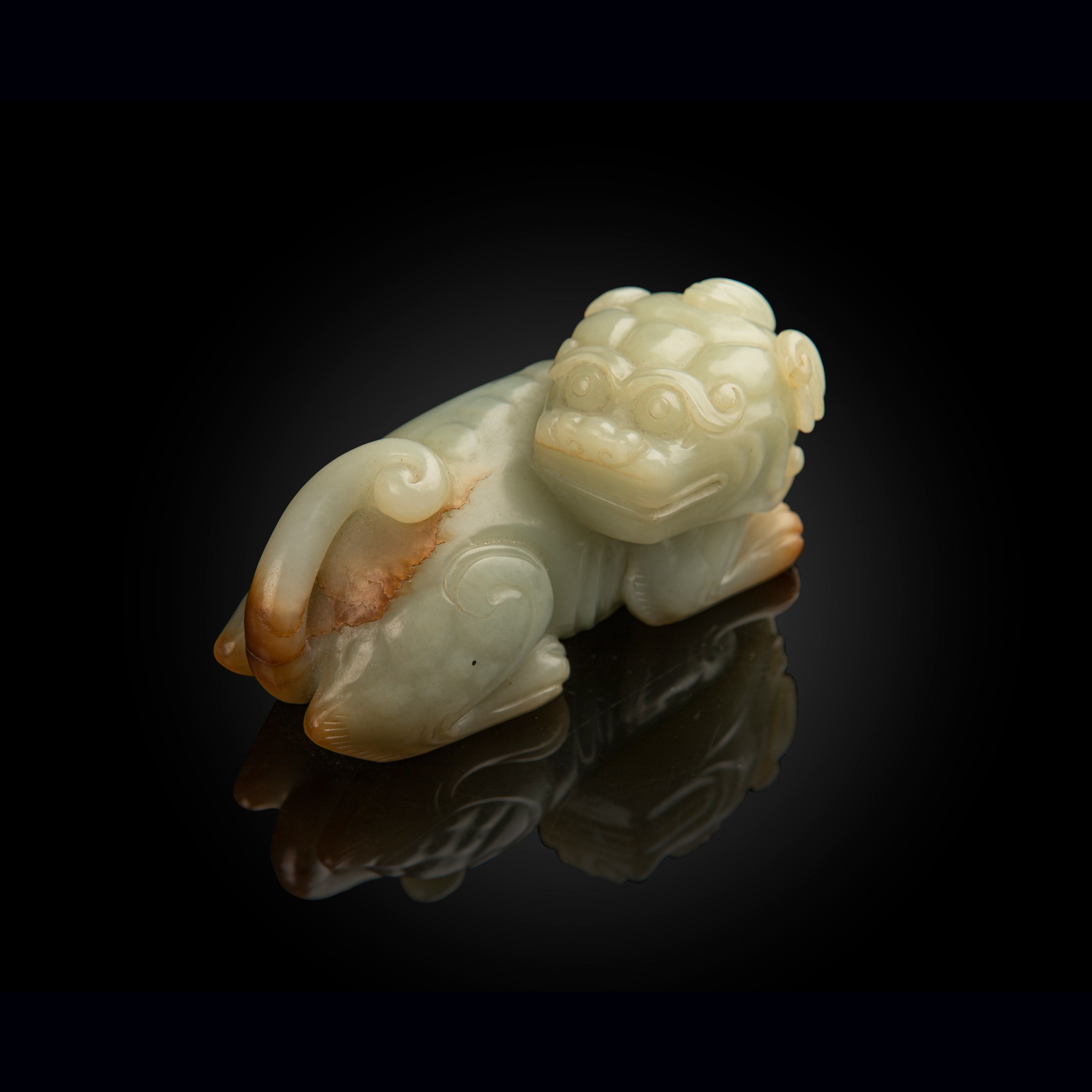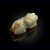 well depicted recumbent with the hind legs and front left leg tucked beneath the body, its head looking backwards, the horned beast further detailed with bulging eyes, the stone with pale celadon colour highlighted with russet veins