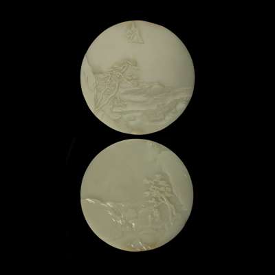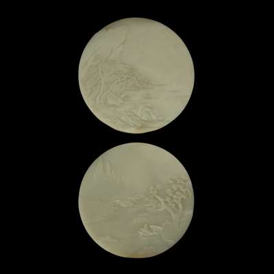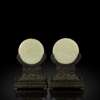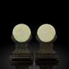 清乾隆 青白玉雕山水人物圓屏一對 配紫檀雕蝙蝠祥雲紋木座