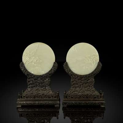 each screen of flattened disc form, one carved to one side depicting a seated elderly scholar by the river bank accompanied by his attendant amid lush pine trees issuing from craggy rocks, the reverse with a large pine tree amid jagged cliffs with a small sampan berthing underneath, the other table screen carved on one side with an elder scholar walking on stick in conversation with a young boy under large pine trees nearby waterfalls, the reverse with another elder scholar playing qin musical instrument on a sampan passing by pine trees growing on the river bank, the stone of pale celadon tone with some russet skin around the edge, each plaque paired with a two-part zitan wood stand, the upper part reticulated carved with bats flying between ruyi-head clouds, further supported on a rectangular stand with fenced border in openwork