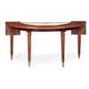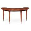 the demilune top with a reeded edge and hinged drop leaves to the back, the centre with a lift-out panel, raised on reeded tapered legs ending in brass caps and castors
