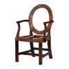 the curved oval back above a serpentine seat and open scrolled arms, raised on square section legs, joined by stretchers; lacking upholstery