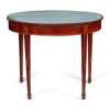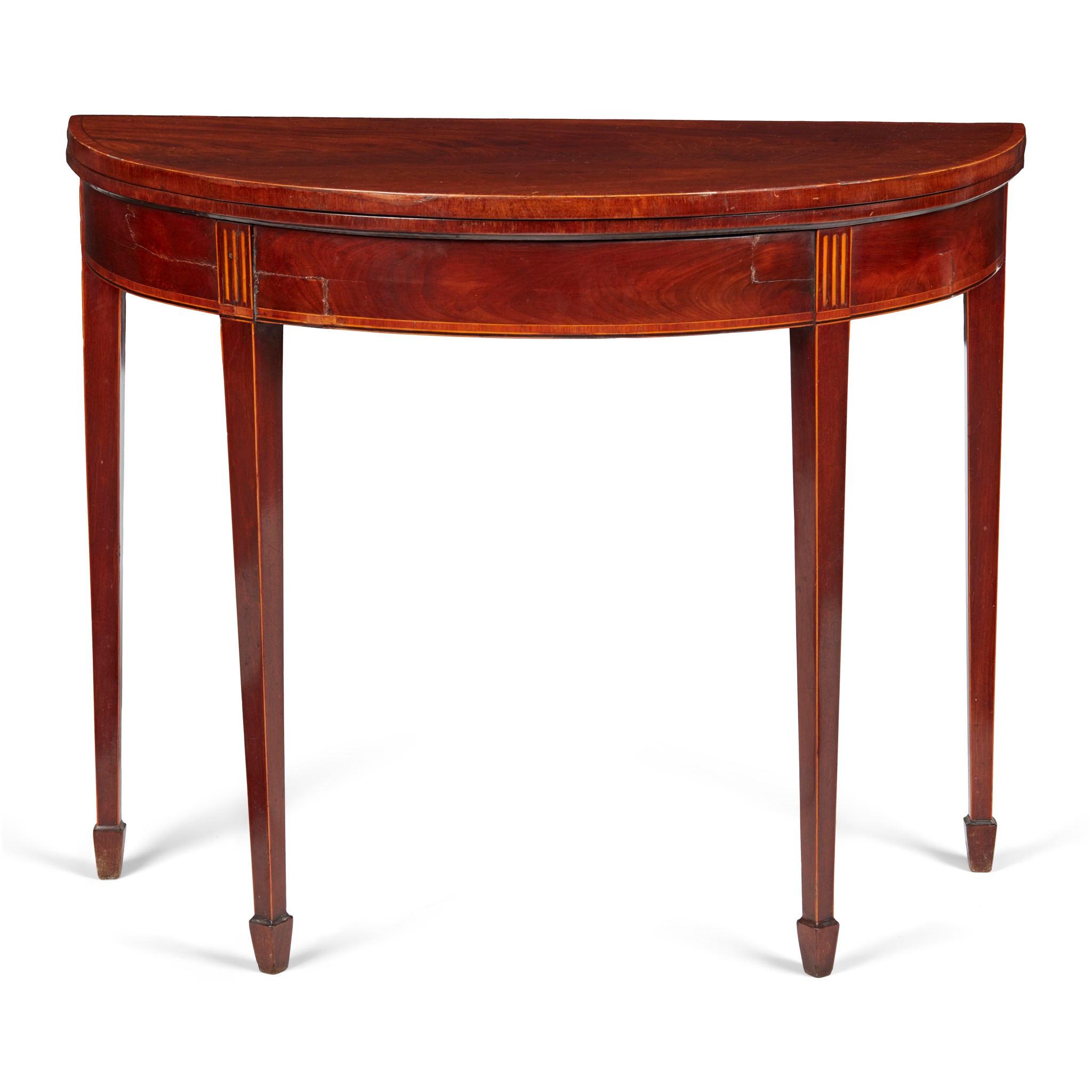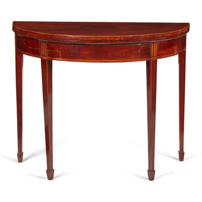 the demilune crossbanded fold-over top above a boxwood inlaid frieze, raised on square section legs with spade feet
