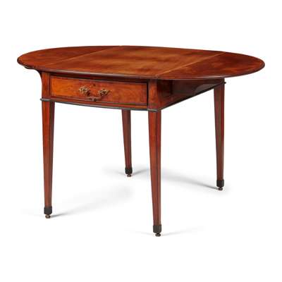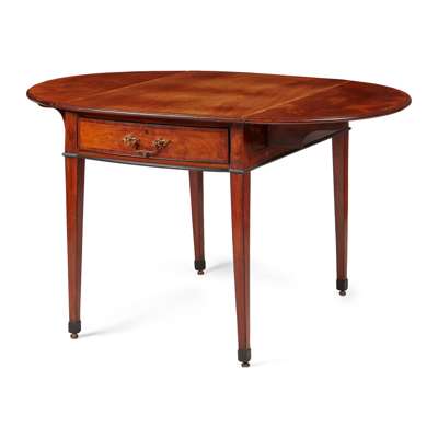 the oval drop-leaf and crossbanded top above bowfront frieze drawers to both ends, raised on square tapering legs ending in leather castors, the whole outlined with ebony stringing