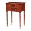 the rectangular top above two boxwood strung short drawers, raised on ring-turned tapering legs ending in brass caps and castors
