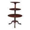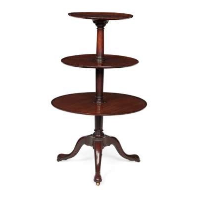 with three dished graduated tiers, raised on a turned column and tripod base, with brass castors