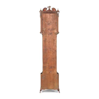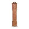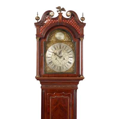 the hood with a swan neck pediment with enamel roundels to the terminals and centred by a brass eagle with brass finials to the corners, above a scale fretwork frieze and arched brass dial with engraved silvered chapter ring and centre, with subsidiary seconds dial, date aperture, twin winding holes, and a signed makers name to the arch boss flanked by Corinthian columns; the trunk with a shaped door with central marquetry roundel flanked by quarter columns, on a plinth base with further marquetry panel and conforming blind fret angles, raised on bracket feet; the twin train, eight-day movement striking a bell
