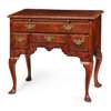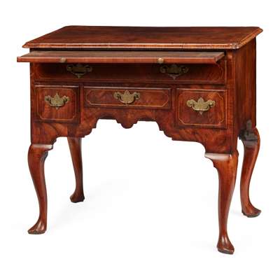 with a moulded crossbanded and inlaid rectangular top with re-entrant corners, above a brushing slide and a long drawer over three short drawers and shaped apron, raised on cabriole legs with pointed pad feet