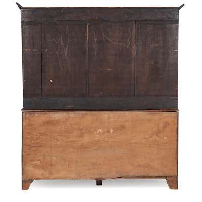 the upper part with a moulded cornice and enclosed back with two shelves; the base with three short frieze drawers above three central short drawers flanked by panel doors and reeded corners, on ogee bracket feet