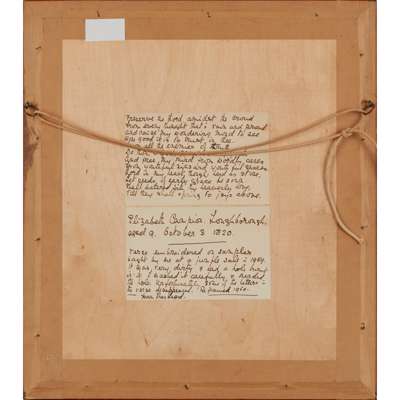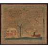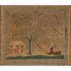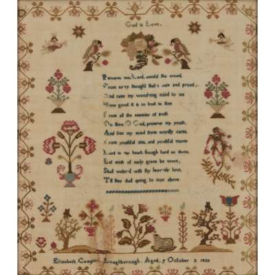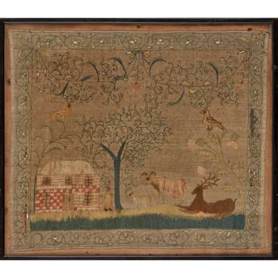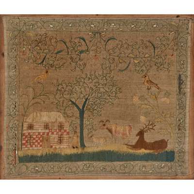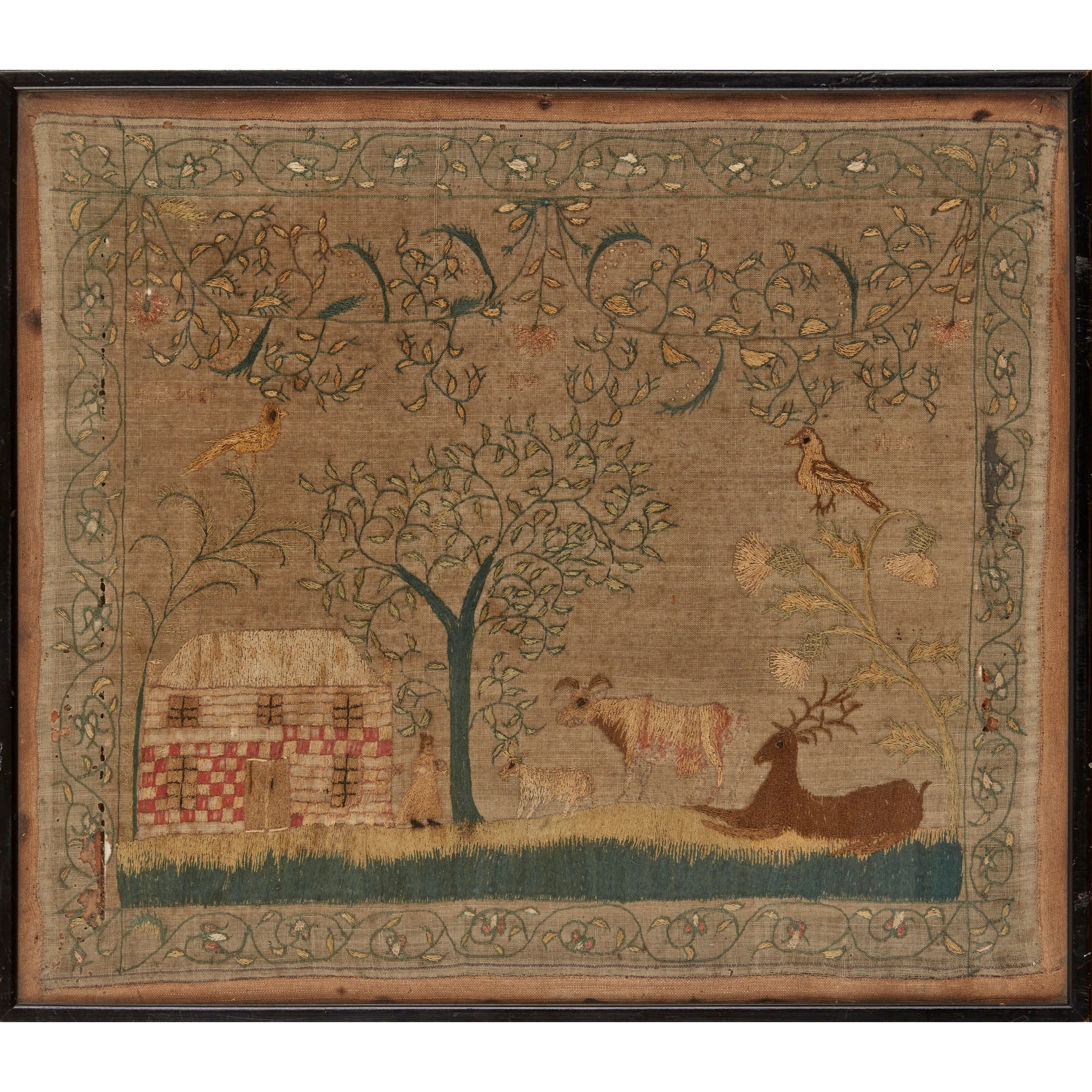 worked in silks on a linen ground, depicting a naive scene with a house, tree, cow, calf, and stag, with thistles and birds enclosed by a meandering scrolling border; together with a LATE GEORGIAN NEEDLEWORK SAMPLER, BY ELIZABETH CAMPION AGED 9, LOUGHBOROUGH, DATED 1820, coloured silks on linen with a central verse titled 'God is Love' on a field with birds, cornucopia, angels, flowering baskets and urns, trees, and a cat, within a meandering carnation border, framed, 35.5cm x 31cm