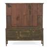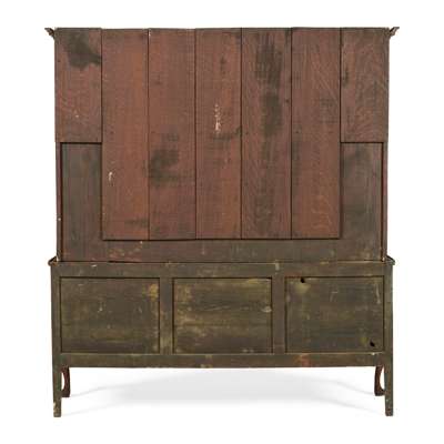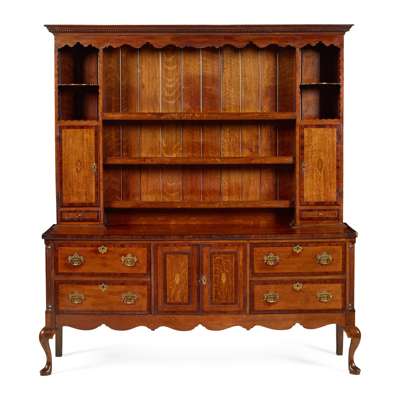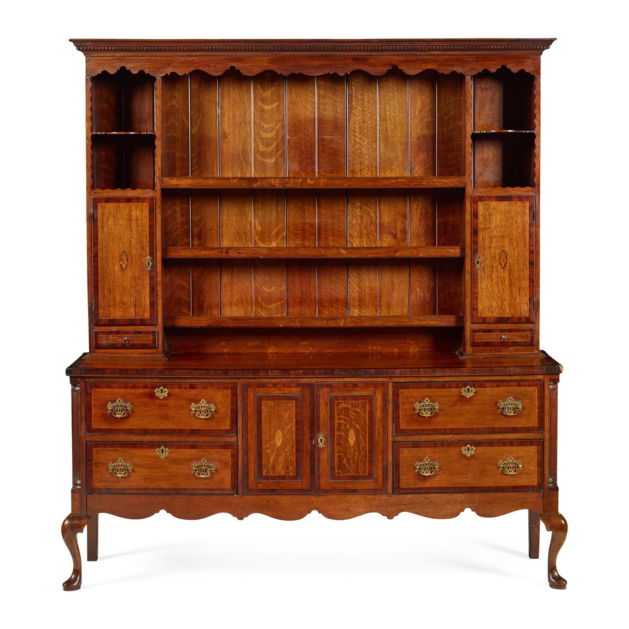 the dentil moulded cornice with a wavy frieze above three open shelves flanked by scalloped niche shelves and cupboards, the base with two short drawers centred by a central cupboard with shell paterae inlaid doors and flanked by reeded quarter columns, raised on cabriole legs ending in pad feet