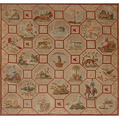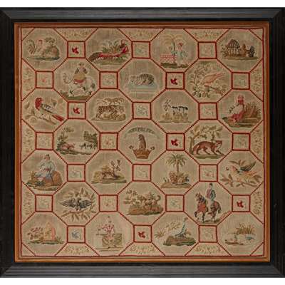 divided into twenty-five octagonal compartments, each with an animal, fowl, or figure, separated by smaller squares with various flower samples, the central compartment with a coronet and motto, framed