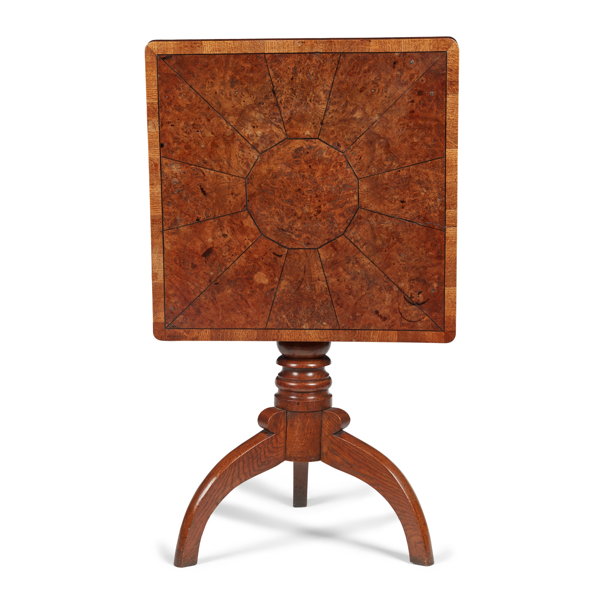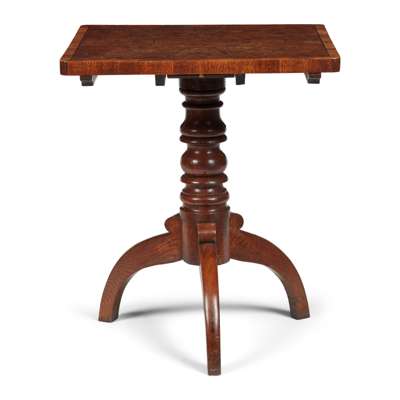the square tilt-top with sectioned veneers and a crossbanded edge, raised on a turned column and arched legs