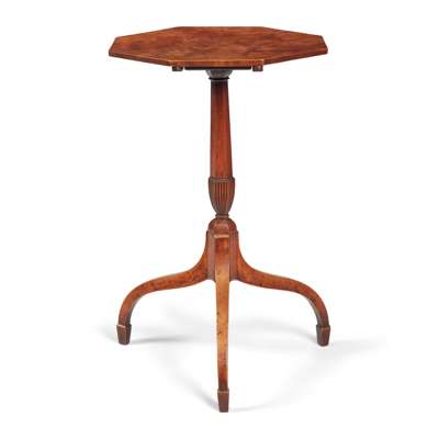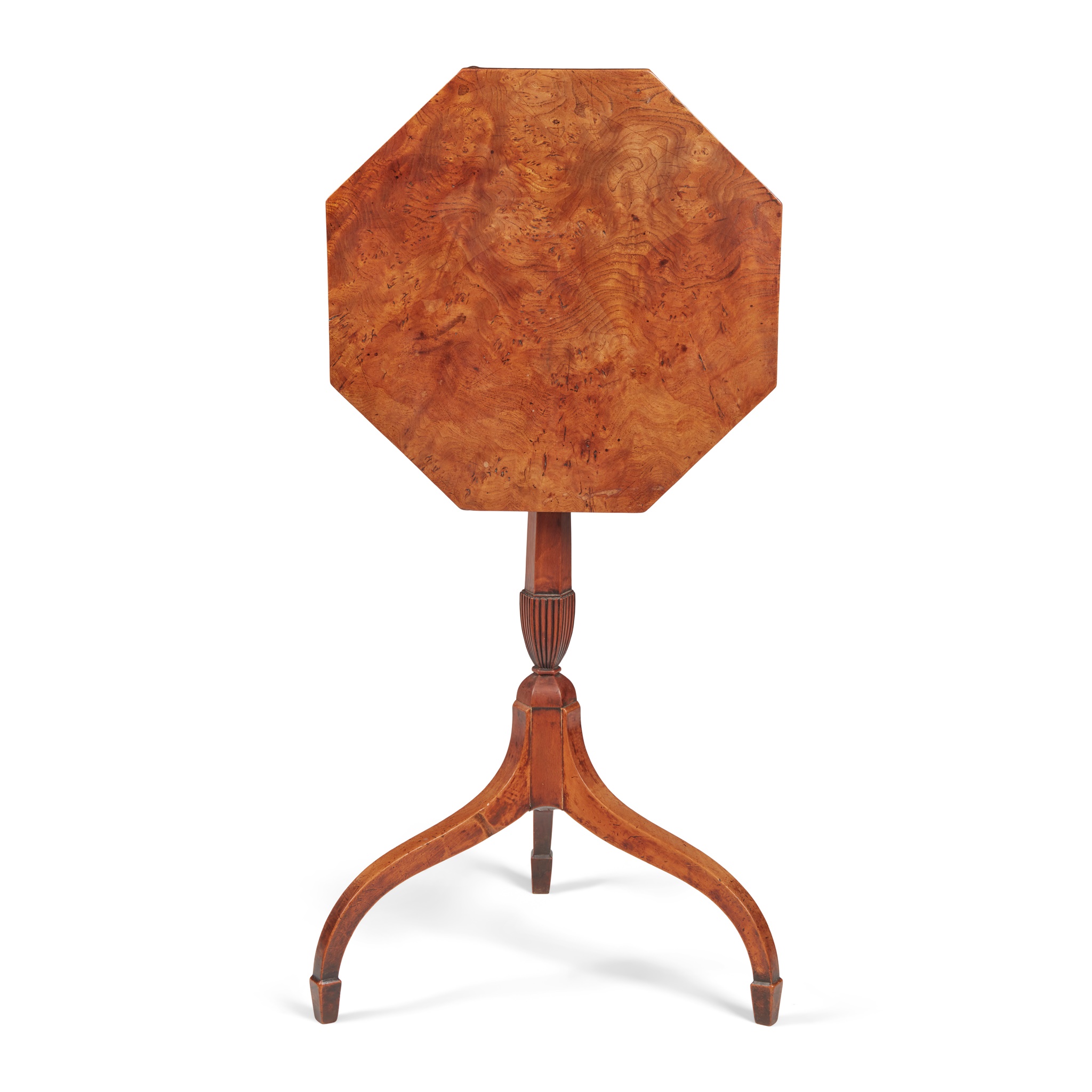 the octagonal tilt-top raised on a slender baluster column and umbrella tripod base with spade feet