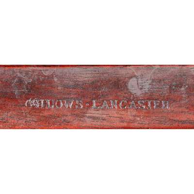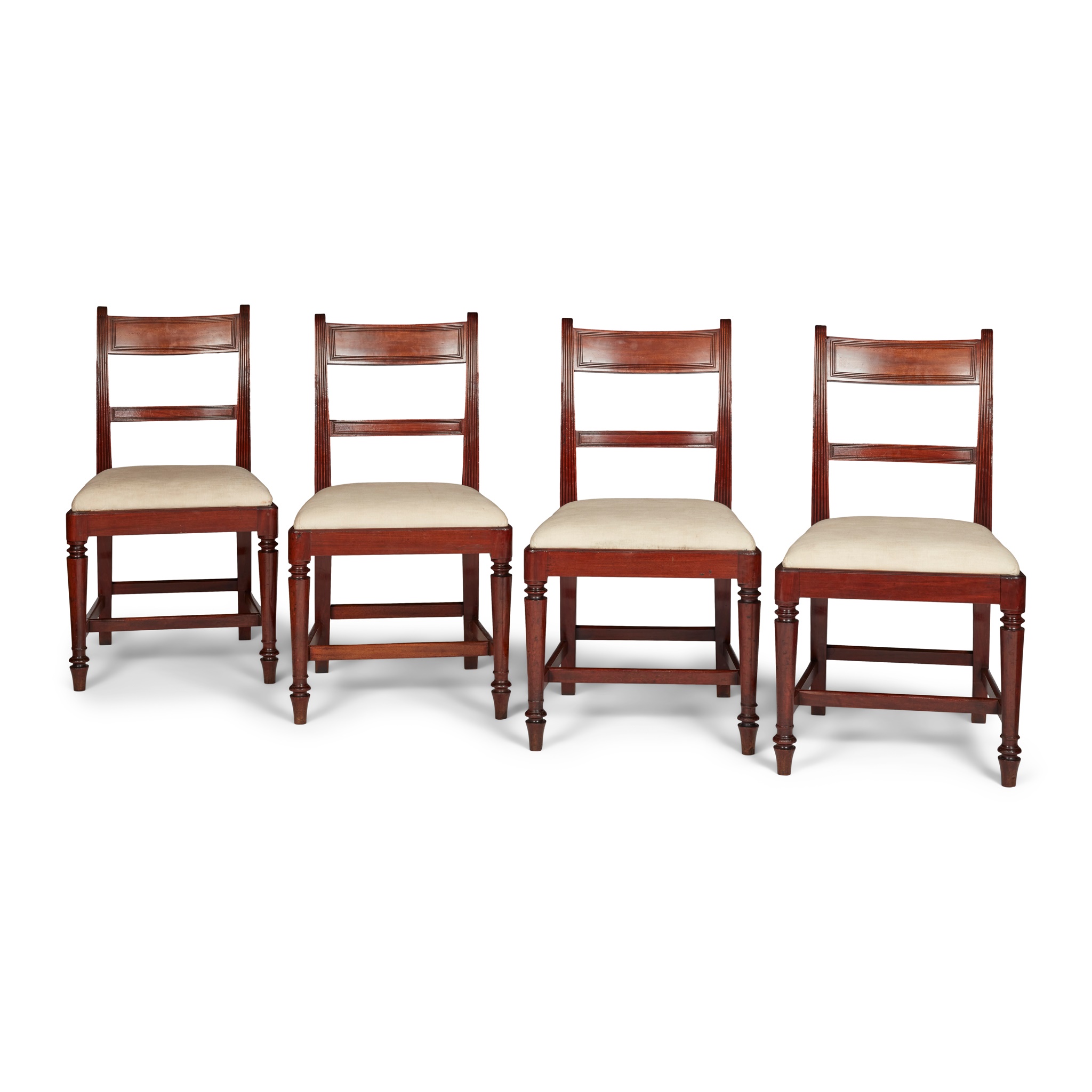 the reeded tablet backs between reeded uprights, over drop-in seats raised on turned and tapered legs joined by stretchers, each stamped GILLOWS LANCASTER